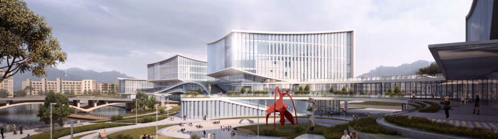 項目由四個功能獨立的建筑單體通過二層連廊緊密銜接在一起,形成一個功能齊聚的建筑主體。外立面設(shè)計靈感來自于風(fēng)琴的琴鍵、豎琴的琴弦等樂器的豎向線條及溫州的山水,營造浪漫靈動的建筑特征。通過打造下沉式廣場,使得主體建筑形體造型設(shè)計以及周邊綠化布局,完美呼應(yīng)地塊周邊優(yōu)美的山水環(huán)境,整體造型舒展蜿蜒,順應(yīng)城市格局棲于水岸。