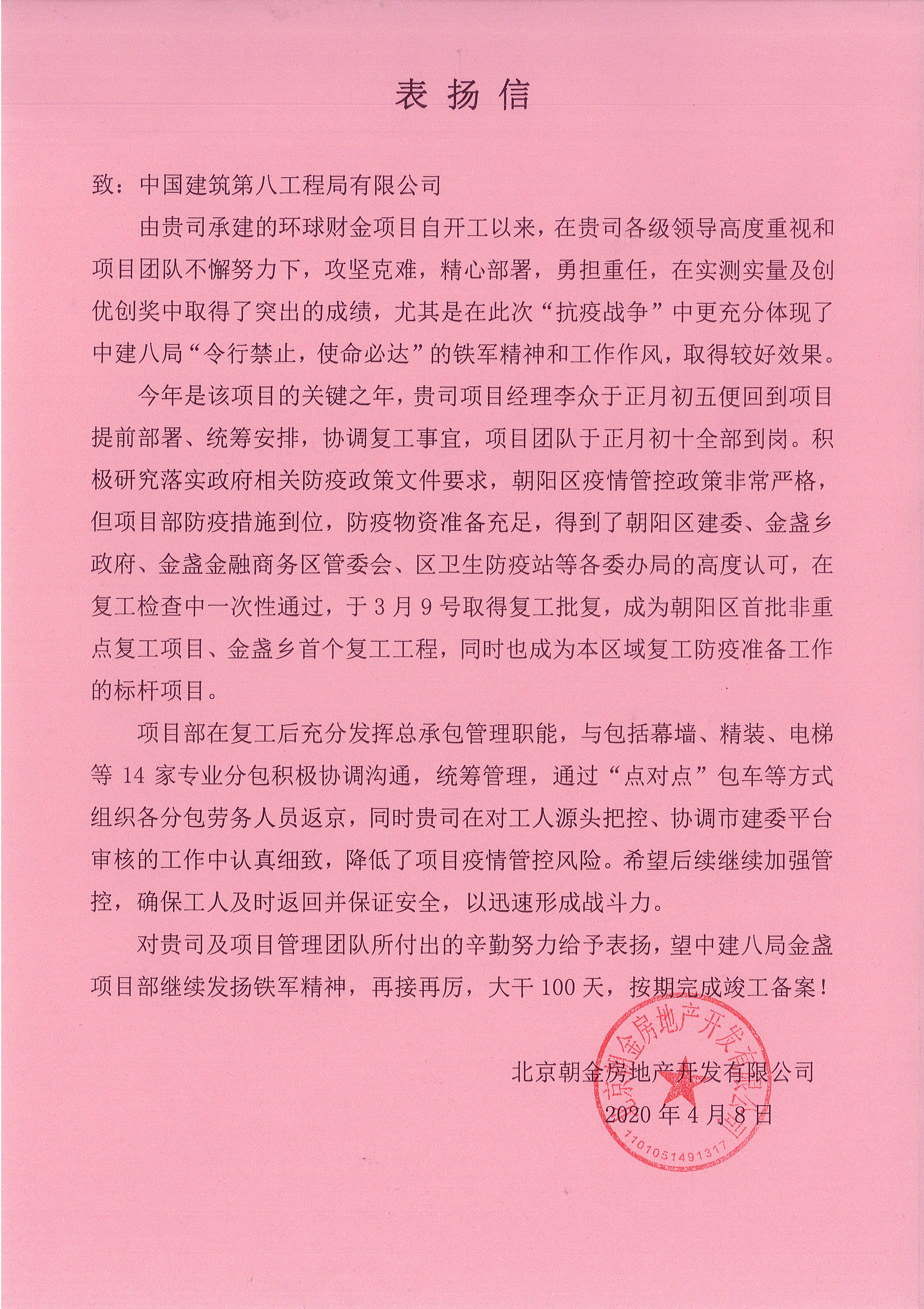 表揚信中提到,在此次抗擊疫情中,金盞項目防疫物資準備充足,疫情管控措施到位,得到了朝陽區(qū)建委、金盞鄉(xiāng)政府、金盞金融商務(wù)區(qū)管委會和區(qū)衛(wèi)生防疫站等各級單位的高度認可,在復(fù)工檢查中一次性通過,成為朝陽區(qū)首批非重點復(fù)工項目、金盞鄉(xiāng)首個復(fù)工項目,同時也成為本區(qū)域復(fù)工防疫準備工作的標桿項目,同時能夠在復(fù)工后充分發(fā)揮總承包管理職能,積極協(xié)調(diào)各參建單位。