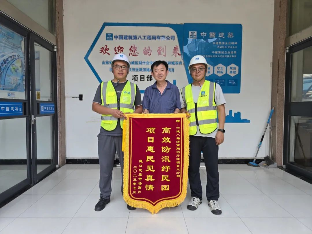 2025-08-22 中建八局一公司濟南雨污分流項目筑牢城市防汛體系 近日,濟南市連續(xù)遭遇強降雨,防汛形勢嚴峻。 中建八局濟南雨污分流項目(第九分部)積極響應(yīng)、迅速行動,有力保障市民出行和城市正常運轉(zhuǎn),贏得居民好評并獲贈錦旗。