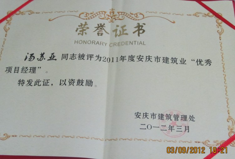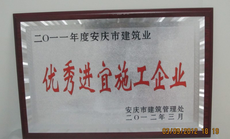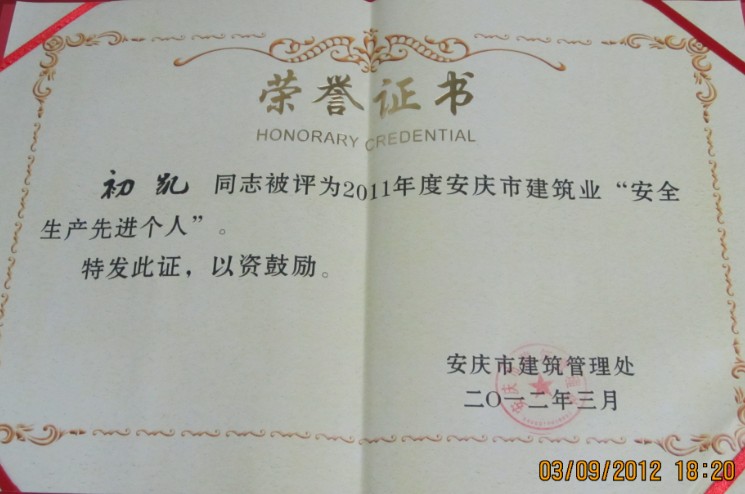 3月9日,安慶市建委隆重召開(kāi)2011年度全市建筑業(yè)評(píng)優(yōu)評(píng)先暨總結(jié)大會(huì),我局榮獲“優(yōu)秀進(jìn)宜施工企業(yè)”榮譽(yù)稱號(hào)、一公司湯蘇亞、初凱分別榮獲“優(yōu)秀項(xiàng)目經(jīng)理”、“安全管理先進(jìn)個(gè)人”榮譽(yù)稱號(hào)。