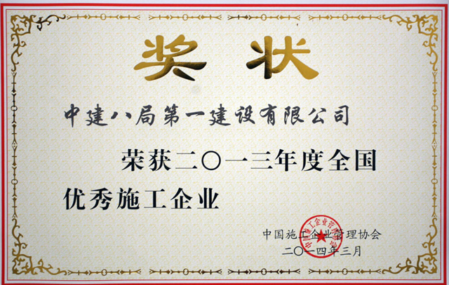 4月19日,中國(guó)施工企業(yè)管理協(xié)會(huì)第29次年會(huì)在南京召開(kāi),會(huì)議宣布了《關(guān)于宣傳表彰2013年度“全國(guó)優(yōu)秀施工企業(yè)”的決定》,公司連續(xù)第六年被評(píng)為“全國(guó)優(yōu)秀施工企業(yè)”稱號(hào)。