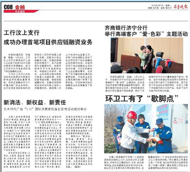 “……‘我們建筑工和清潔工是一個階層,他們的辛苦我們也感同身受?!椖坎堪踩偙O(jiān)黃繼明如此表示設立的目的。”這篇題為《環(huán)衛(wèi)工有了歇腳點》的報道刊登在了《齊魯晚報》3月17日C08版,對一公司濟寧人醫(yī)院項目部設立“環(huán)衛(wèi)工歇腳點”的做法進行了報道。