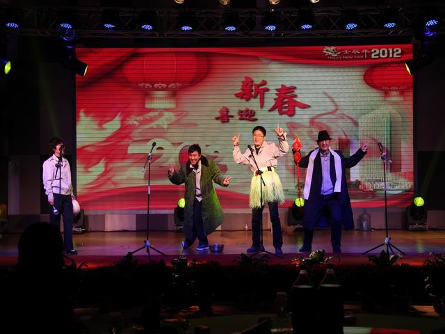 團拜會演出在富有激情的舞蹈《南非風(fēng)情》中拉開了帷幕。整臺演出精彩紛呈,高潮迭起。員工自編自演的各類節(jié)目豐富多彩,幸運大抽獎更是讓員工驚喜連連,演出現(xiàn)場歡聲笑語不斷。相聲《咱公司的那點事》、小品《牛郎與織女》、啞劇《候車室的故事》讓現(xiàn)場觀眾笑成一片;歌曲《相親相愛》唱出了一公司員工團結(jié)互助是一家人的心聲;歌伴舞《荷塘月色》在現(xiàn)場燈光和舞臺的配合下,為大家呈現(xiàn)了一幅唯美的畫面;別具風(fēng)格的三句半《公司喜事多》,讓大家過了一把情景劇版三句半隱;情景詩朗誦《閃亮的日子 閃亮的青春》則為大家講述了一群年輕人到工地后半年的切身感受;歌手楊坤的《無所謂》被演員模仿的惟妙惟肖,足以以假亂真;舞蹈串燒《青春旋律》讓大家感受到了公司年輕人的青春活力;小品《施工情》講述了公司員工舍小家顧大家、令行禁止、使命必達的精神,得到了現(xiàn)場觀眾的共鳴。演出在氣勢磅礴的《走向復(fù)興》中圓滿落幕,出席團拜會的領(lǐng)導(dǎo)同志走上舞臺,同全體演員合影留念。