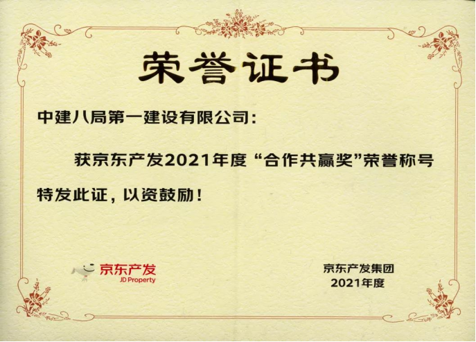 近日,中建八局一公司榮獲京東集團頒發(fā)的“合作共贏獎”,成為獎項創(chuàng)立以來首次獲獎的總承包施工單位,也是2021年京東集團頒發(fā)的唯一一項“合作共贏獎”。