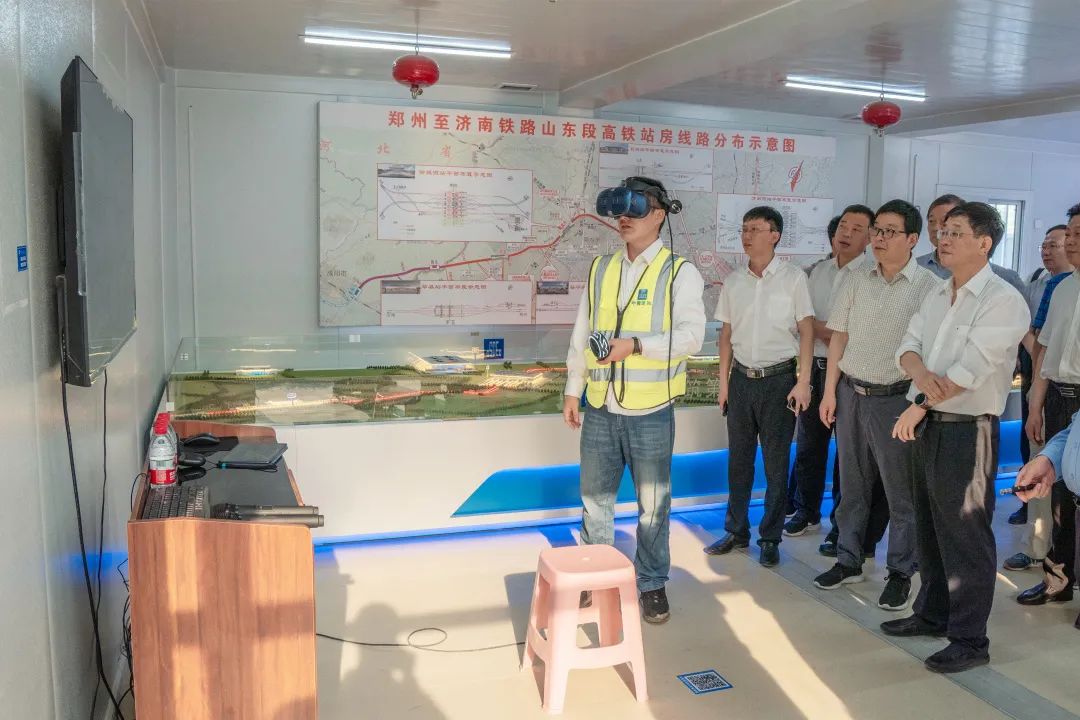 王同軍一行來到聊城西站升降式沙盤室,聽取了濟鄭鐵路山東段高鐵線路走向、聊城西站建設規(guī)模、設計理念、工期計劃等方面的匯報,通過VR詳細了解了工程內外裝飾整體效果。