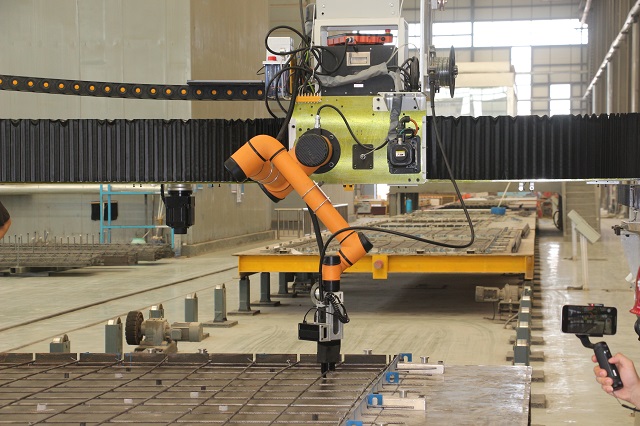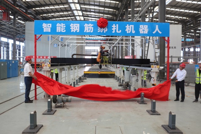 隨后,來到第六跨疊合板自動化流水生產(chǎn)線,寧文忠、李鐵軍共同為智能鋼筋綁扎機(jī)器人揭彩。該機(jī)器人是一種可視覺導(dǎo)引的六軸鋼筋綁扎機(jī)器人,安放在流水線的鋼筋綁扎區(qū)域,能夠高效精準(zhǔn)的進(jìn)行鋼筋綁扎工作,具有自動識別,精準(zhǔn)高效、協(xié)同作業(yè)、一機(jī)雙控等特點,綁扎速度是人工的2倍,大大提高鋼筋綁扎效率。