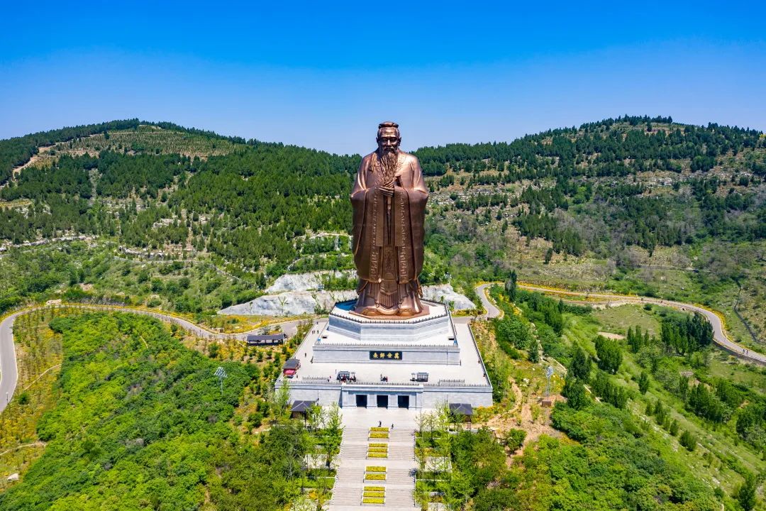 孔子像整體高72米,東西跨度35米,南北寬度30米,像體鋼結(jié)構(gòu)骨架用鋼量600噸,表面黃銅用量150噸,利用大傾角超高超薄銅板施工技術(shù),完美展示了孔子“溫而厲,威而不猛,恭而安”的圣人形象。
