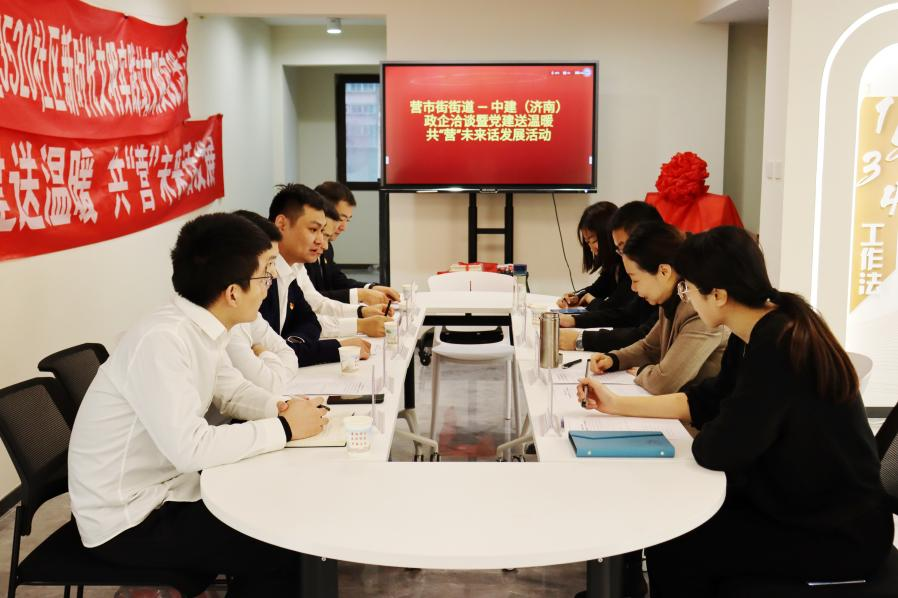 為推動(dòng)區(qū)域黨建互聯(lián)互動(dòng),提升基層黨組織的組織力、凝聚力和戰(zhàn)斗力,12月14日,濟(jì)南槐蔭營市街街道辦與濟(jì)南雨污分流項(xiàng)目黨支部與共同開展“政企洽談暨黨建聯(lián)建送溫暖 共“營”未來話發(fā)展”活動(dòng),營市街街道黨工委副書記、辦事處主任呂健,黨工委副書記、紀(jì)檢監(jiān)察工委書記、三級(jí)調(diào)研員胡慧敏,中建(濟(jì)南)投資建設(shè)有限公司辦公室主任楊恒,中建八局一公司濟(jì)南雨污分流項(xiàng)目黨支部書記辛建鑫、專職副書記余帥等參加活動(dòng)。