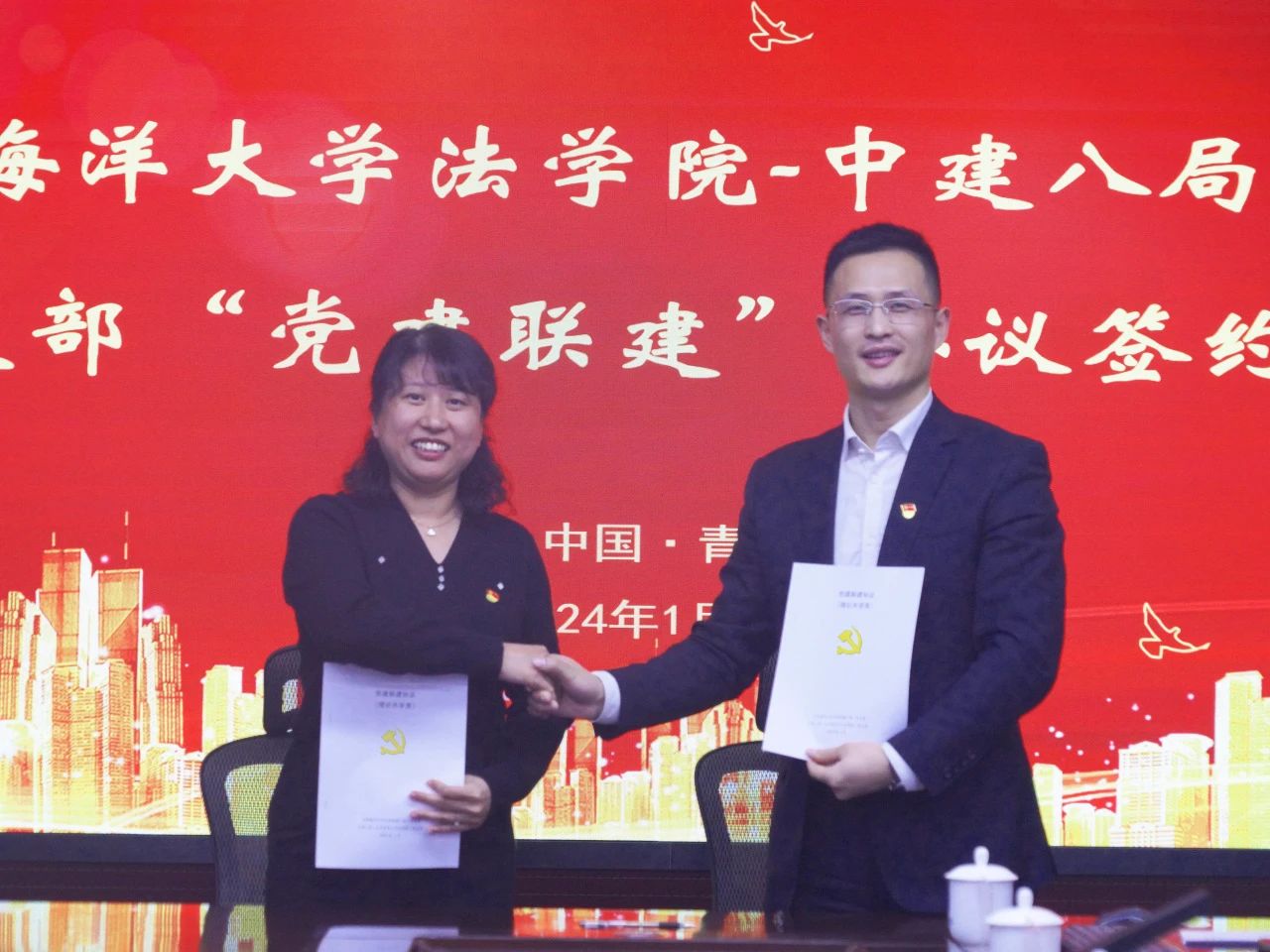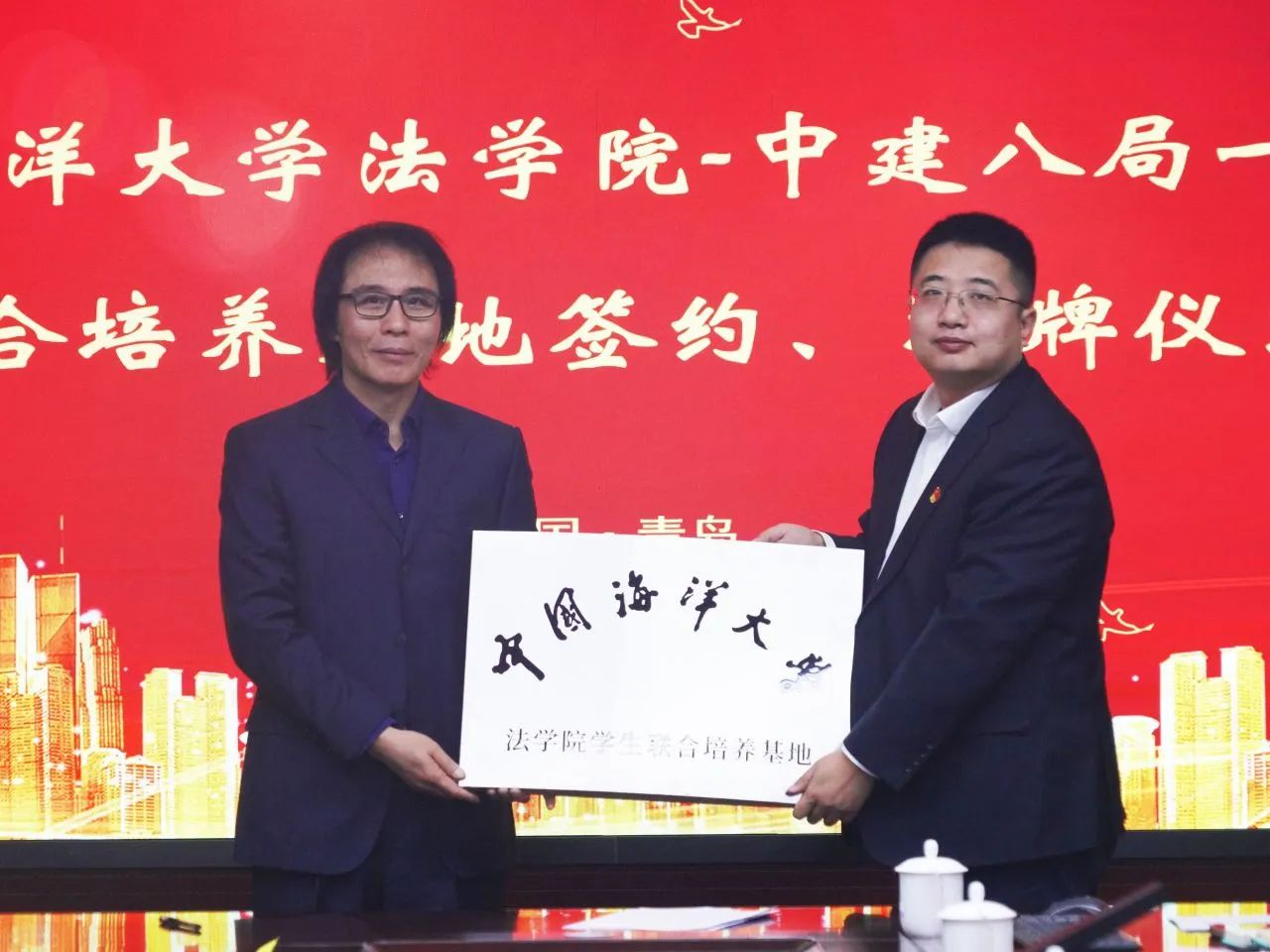 1月8日,中國(guó)海洋大學(xué)法學(xué)院與中建八局一公司聯(lián)合培養(yǎng)基地簽約授牌暨黨支部“黨建聯(lián)建”簽約儀式在青島舉行。法學(xué)院黨委書記劉健、院長(zhǎng)桑本謙、辦公室主任王雅婕、法碩中心執(zhí)行主任于曉藝;中建八局一公司相關(guān)負(fù)責(zé)人參加。