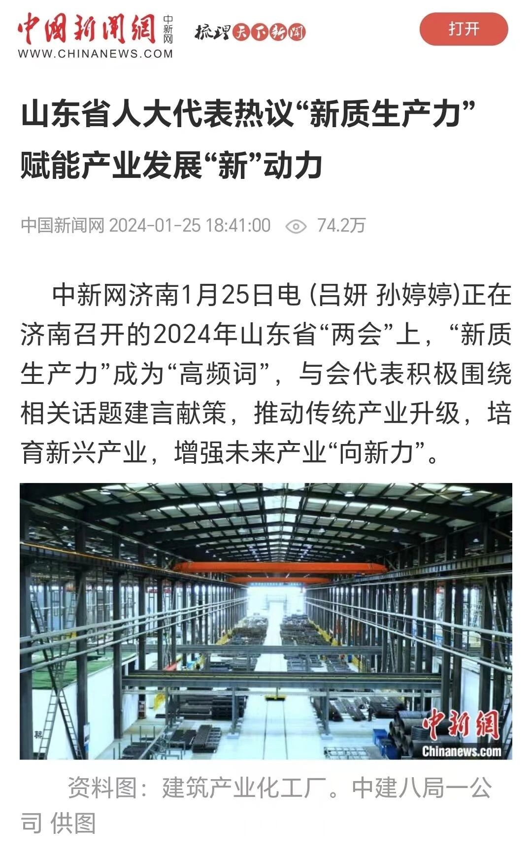 1月25日,2024年山東省“兩會(huì)”期間,中國(guó)新聞網(wǎng)刊發(fā)題為《山東省人大代表熱議“新質(zhì)生產(chǎn)力” 賦能產(chǎn)業(yè)發(fā)展“新”動(dòng)力》的報(bào)道。山東省人大代表、中建八局一公司黨委書(shū)記、董事長(zhǎng)齊朋就“新質(zhì)生產(chǎn)力”推動(dòng)建筑業(yè)高質(zhì)量發(fā)展等相關(guān)問(wèn)題分享了自己的觀點(diǎn)和建議。