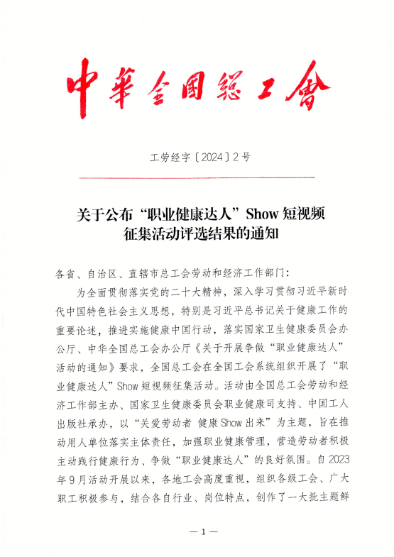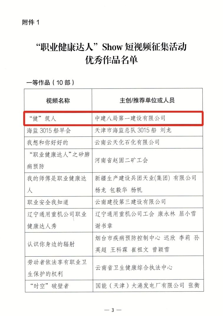 近日,由中華全國總工會(huì)勞動(dòng)和經(jīng)濟(jì)工作部主辦、國家衛(wèi)生健康委職業(yè)健康司支持、中國工人出版社承辦的“職業(yè)健康達(dá)人”Show短視頻征集活動(dòng)公布獲獎(jiǎng)名單,中建八局一公司參選作品《“健”筑人》專題視頻短片榮獲一等獎(jiǎng)。