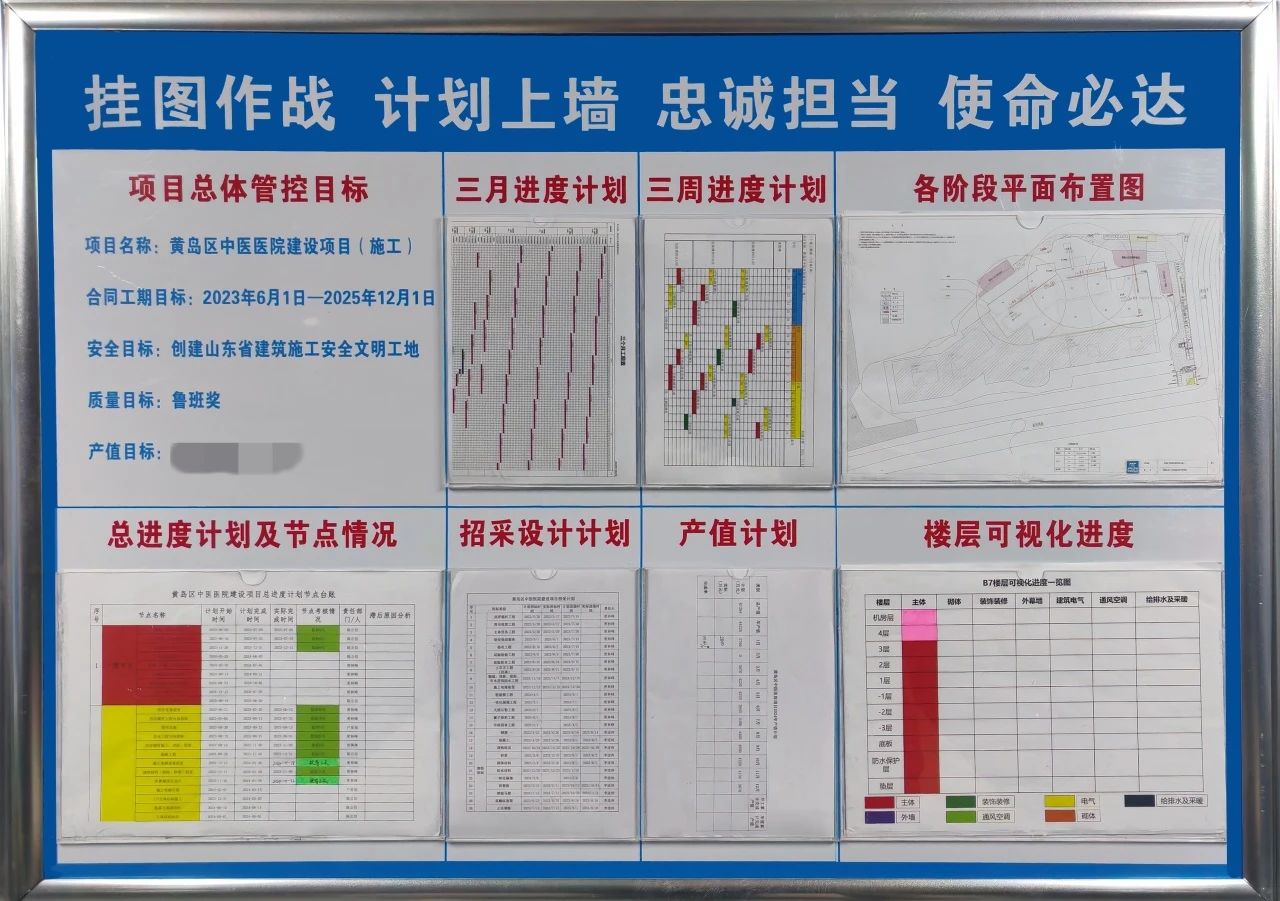 掛圖是手段,作戰(zhàn)是核心。在建項目全覆蓋開展“掛圖作戰(zhàn)”,上墻“一目標一指令一圖六計劃”,即項目工期、安全、質量目標、月度指令單、立面進度圖、總進度計劃、總進度計劃節(jié)點臺賬、月進度計劃、周進度計劃、招采計劃、產值計劃。