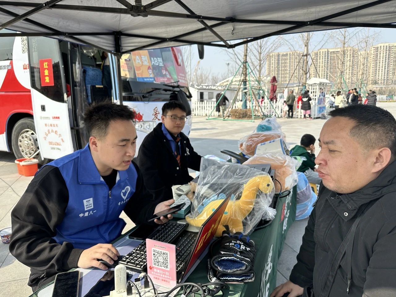 安裝公司“藍馬甲”青年志愿服務(wù)團隊聯(lián)合山東省血液中心流動獻血站,在現(xiàn)場為獻血者登記信息、測量血壓。