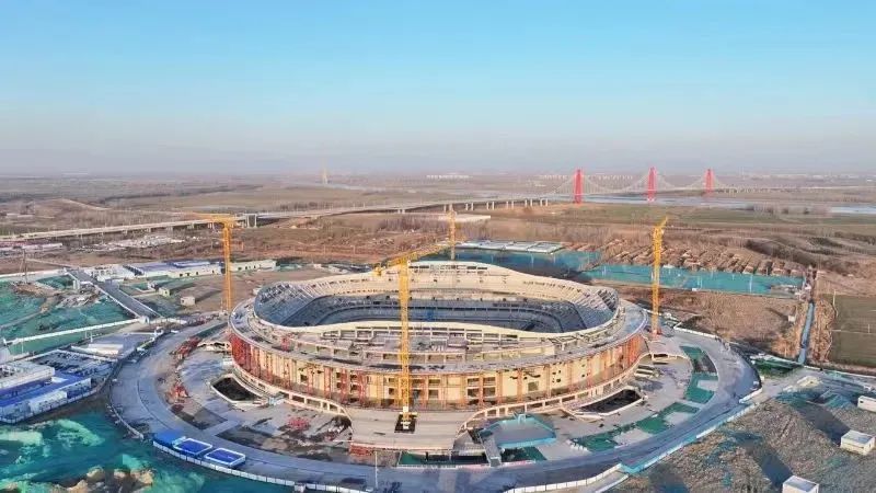 中建八局始終積極融入山東省發(fā)展戰(zhàn)略,服務(wù)綠色低碳高質(zhì)量發(fā)展先行區(qū)建設(shè),以一座座精品工程,助推塑造山東高質(zhì)量發(fā)展新優(yōu)勢(shì)。黃河體育中心專業(yè)足球場(chǎng)項(xiàng)目位于濟(jì)南新舊動(dòng)能轉(zhuǎn)換起步區(qū),總建筑面積19.7萬平方米,是山東省首個(gè)6萬座專業(yè)足球場(chǎng),目前世界最大的單層PTFE網(wǎng)格覆膜結(jié)構(gòu)工程,足球場(chǎng)屋頂覆膜結(jié)構(gòu)面積約4.3萬平方米,為同類建筑之最、透光率是世界最高。目前,項(xiàng)目已完成下部鋼結(jié)構(gòu)施工,即將進(jìn)入屋蓋鋼結(jié)構(gòu)施工階段。