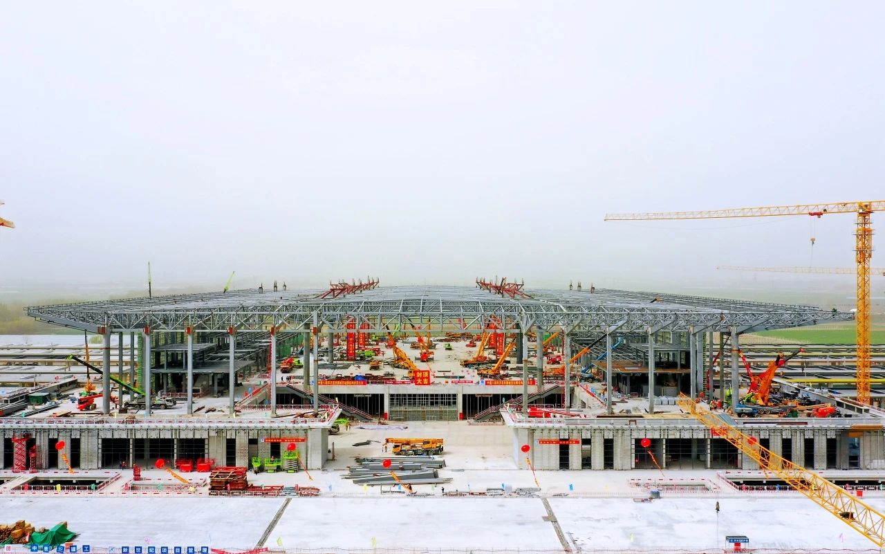 站房屋蓋的大跨度雙向正交空間桁架,整體尺寸為168米*233.3米,相當于5個標準足球場大小,其中主桁架最大跨度63米,次桁架分區(qū)最大提升面積63米*55米,相當于8個標準籃球場大小,最大提升高度26米,約為9層樓高。項目部合理布置鋼結(jié)構(gòu)安裝方案,嚴格把控焊接質(zhì)量,順利完成施工任務。