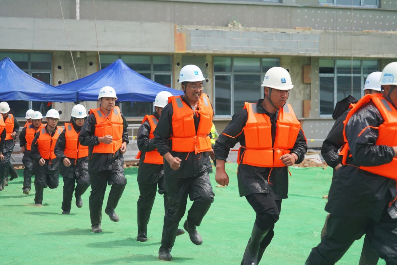 啟動儀式后,項目開展了防臺防汛應(yīng)急演練。青島市防汛抗旱指揮部、青島市住房和城鄉(xiāng)建設(shè)局防汛工作領(lǐng)導(dǎo)小組同時發(fā)布降雨橙色預(yù)警,項目部防汛應(yīng)急小組迅速集結(jié),組織現(xiàn)場巡查,做好應(yīng)急救援準(zhǔn)備。