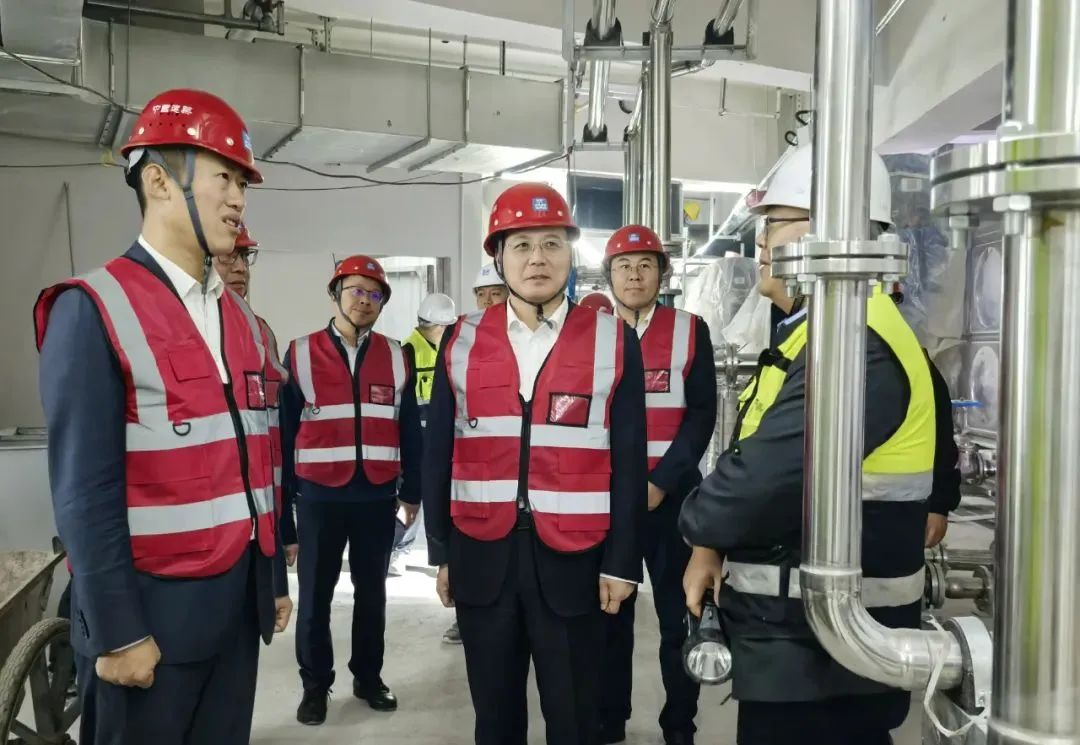 在項目施工現(xiàn)場,周可璋一行實地查看項目建設進展,仔細檢查項目地下室、機房等重點部位,詳細了解項目策劃計劃、安全生產、文明施工、質量管控、技術創(chuàng)新等各項工作落實落地情況,并與一線建設者深入交流,詢問項目建設過程中面臨的重點難點問題。