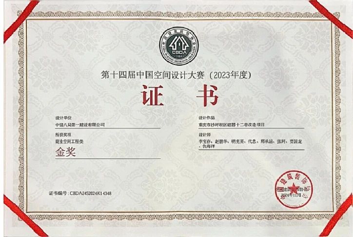 中建八局一公司榮獲2023年度中國建筑裝飾杰出商業(yè)空間設(shè)計機構(gòu),原創(chuàng)方案設(shè)計《重慶市沙坪壩區(qū)磁器十二巷全專業(yè)改造項目》榮獲商業(yè)空間工程類金獎,李寶存榮獲“福田杯”2023年度中國十大杰出建筑裝飾設(shè)計師。