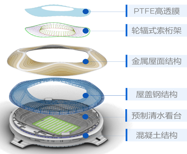 項(xiàng)目屋蓋結(jié)構(gòu)由鋼結(jié)構(gòu)索膜結(jié)構(gòu)和金屬屋面組成,形成平面投影為中央開孔直徑約280米的“鋼鐵圓環(huán)”,屋頂沿環(huán)向呈波浪起伏狀,是國(guó)內(nèi)首例專業(yè)足球場(chǎng)大規(guī)模應(yīng)用高透光率PTFE網(wǎng)格膜材料。