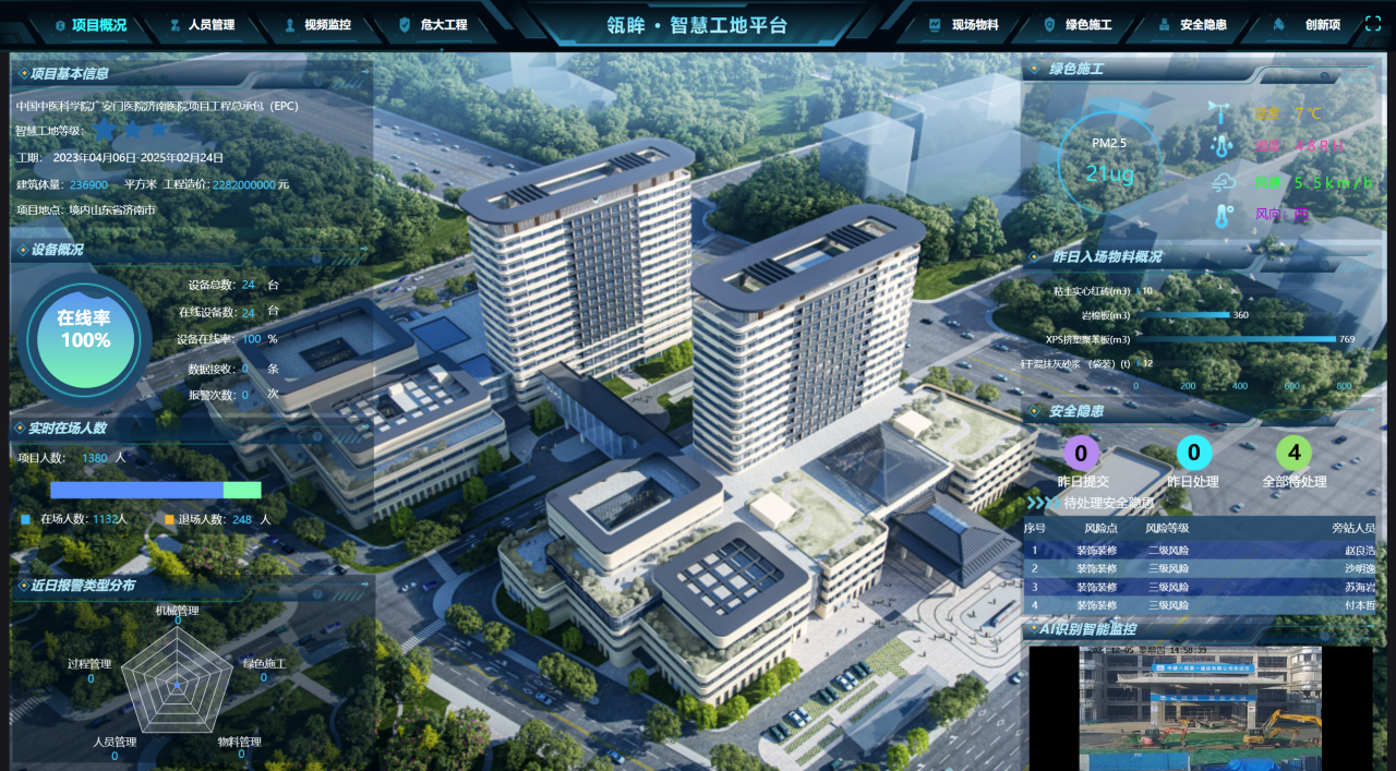 中國中醫(yī)科學(xué)院廣安門醫(yī)院濟(jì)南醫(yī)院項(xiàng)目應(yīng)用公司自主研發(fā)的瓴眸·智慧工地平臺,構(gòu)建“大型醫(yī)療工程全過程智慧管理系統(tǒng)”,通過移動互聯(lián)、物聯(lián)網(wǎng)、云計(jì)算大數(shù)據(jù)等新一代信息技術(shù),形成危大工程監(jiān)管、現(xiàn)場物料管理、安全隱患排查等“6+4+N”智慧管理成果,實(shí)現(xiàn)智能化、網(wǎng)絡(luò)化、數(shù)據(jù)化現(xiàn)場管控。