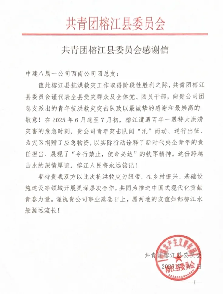 經(jīng)過(guò)幾天奮戰(zhàn),突擊隊(duì)圓滿完成任務(wù)。撤離前,榕江縣村民與當(dāng)?shù)仄髽I(yè)自發(fā)組織晚會(huì),為各位志愿者送上象征“喜慶、吉祥、圓滿”的“紅雞蛋”,以表示感謝。共青團(tuán)榕江縣委員會(huì)送來(lái)感謝信,對(duì)八局一公司的央企擔(dān)當(dāng)、鐵軍作風(fēng)表示認(rèn)可。