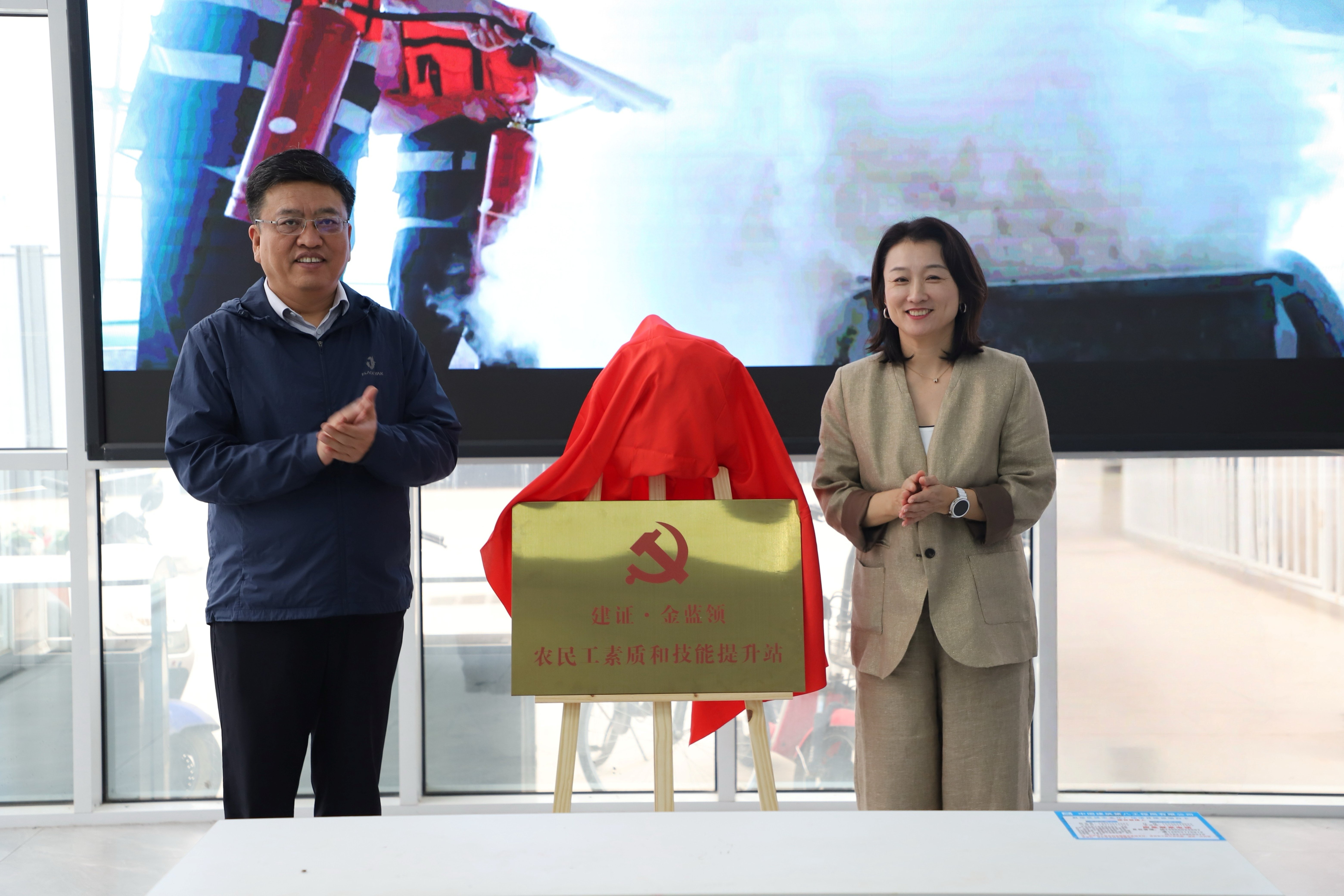 期間,譚博一行參觀了項(xiàng)目綜合展廳、工友綜合服務(wù)中心與工友生活區(qū),詳細(xì)了解項(xiàng)目建設(shè)進(jìn)展與生活工作條件,對(duì)項(xiàng)目工會(huì)工作開展情況給予肯定。譚博、聶麗共同為項(xiàng)目“建證·金藍(lán)領(lǐng)”農(nóng)民工素質(zhì)和技能提升站揭牌。