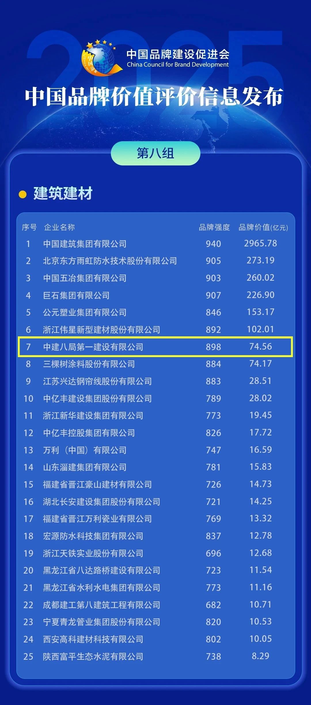 2025-05-13 行業(yè)第七!中建八一品牌價(jià)值再進(jìn)位 5月10日,由中國(guó)品牌建設(shè)促進(jìn)會(huì)、中國(guó)資產(chǎn)評(píng)估協(xié)會(huì)主辦,新華社品牌工作辦公室、《中國(guó)品牌》雜志社等單位承辦的“2025中國(guó)品牌價(jià)值評(píng)價(jià)信息”在浙江德清正式發(fā)布。 中建八局一公司以品牌強(qiáng)度898、品牌價(jià)值74.