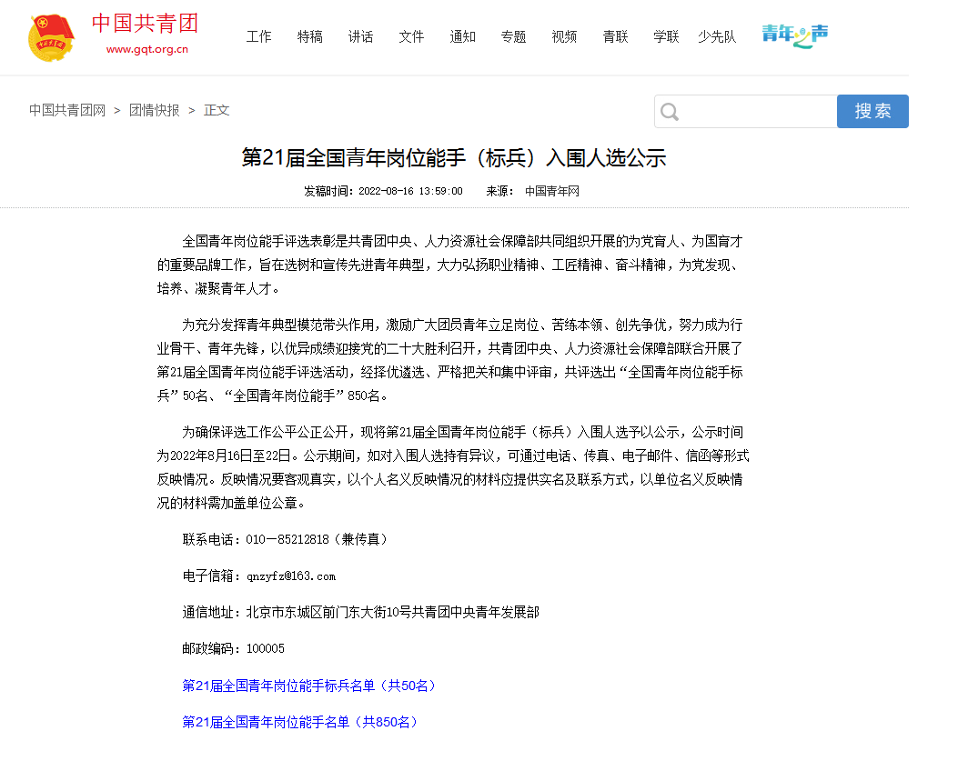 近日,共青團(tuán)中央公示了第21屆全國(guó)青年崗位能手(標(biāo)兵)入圍人選,公司員工張業(yè)、陳宇航榮獲“全國(guó)青年崗位能手”稱號(hào)。