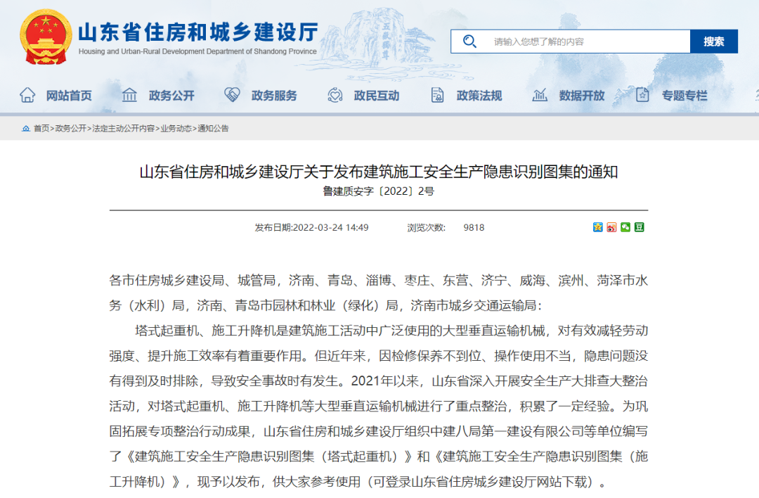 近日,由中建八局一公司“主筆”的《建筑施工安全生產(chǎn)隱患識別圖集(塔式起重機)》和《建筑施工安全生產(chǎn)隱患識別圖集(施工升降機)》,在山東省住房和城鄉(xiāng)建設(shè)廳官網(wǎng)發(fā)布,成為全省建筑施工隱患排查治理的重要參考、機械設(shè)備安全管理的指導文件。