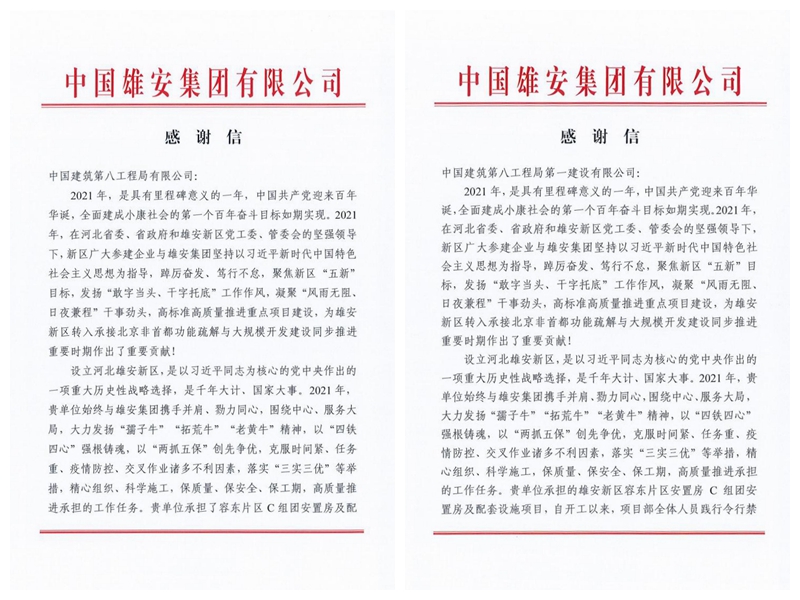 服務千年大計,筑夢未來之城。 近日,容東片區(qū)C組團安置房及配套設施項目收到中國雄安集團感謝信,高度贊揚公司在助力新區(qū)回遷群眾喜圓“新居”夢過程中展現(xiàn)出的非凡勇氣和堅韌精神。