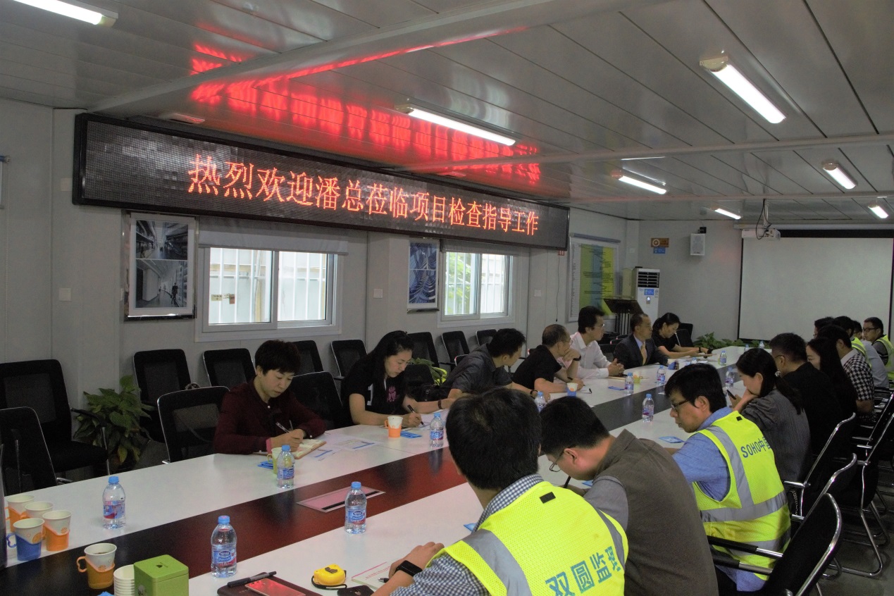 潘石屹一行首先參觀了施工現場,對現場的幕墻質量及其安裝定位進行了詳細檢查。在隨后的檢查會議中,各相關參建單位都做了詳細全面的匯報。最后,潘石屹表示,希望八局繼續(xù)保持現有品質,同時繼續(xù)加強現場管理,嚴把質量關,精益求精。
