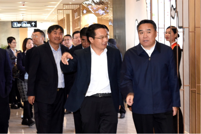 董文祥向山東高速集團黨委書記、董事長鄒慶忠介紹安丘服務區(qū)情況