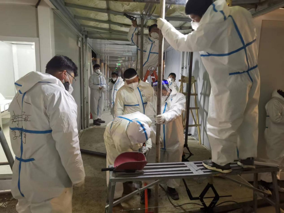3月18日,在接到吉林市高新南區(qū)隔離方艙建設(shè)任務(wù)后,公司副總經(jīng)理寧文忠擔(dān)任總指揮,華北、安裝、裝飾公司迅速部署,僅用5個小時完成人員調(diào)配、核酸檢測和后備物資的集結(jié)。首發(fā)隊伍于當(dāng)晚六點(diǎn)出發(fā),星夜兼程、跨越千里奔赴吉林。