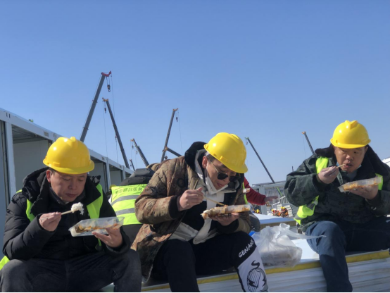 3月的吉林氣溫低至0℃,中建八一1300余名建設(shè)者“零點(diǎn)”作戰(zhàn),跟疫情搶時間,12小時內(nèi)完成A5區(qū)全部機(jī)械布置,24小時內(nèi)完成A5區(qū)全部底板拼裝,48小時內(nèi)完成654間板房主體拼裝,72小時內(nèi)完成654間板房墻板及門窗安裝。