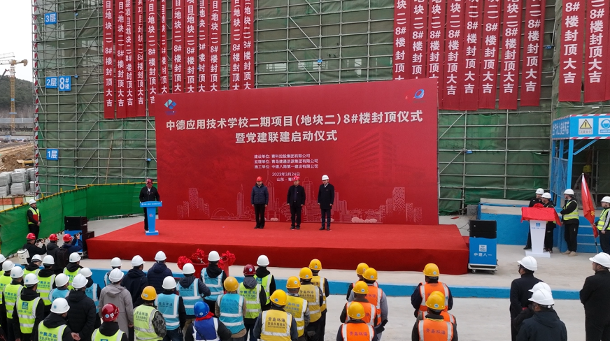 近日,中德應(yīng)用技術(shù)學(xué)校二期項目舉行封頂儀式暨黨建聯(lián)建啟動儀式。青科控股集團(tuán)總經(jīng)理張偉、中德應(yīng)用技術(shù)學(xué)校副校長丁奉亮、青島建通浩源集團(tuán)總經(jīng)理王建國、中建八局一公司青島公司相關(guān)負(fù)責(zé)人及施工現(xiàn)場建設(shè)者代表參加。