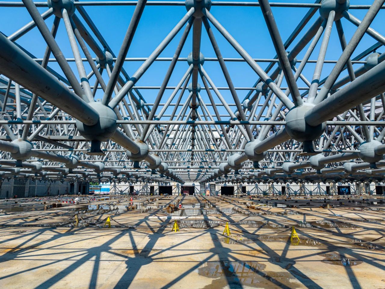 本次會展中心鋼網(wǎng)架采用正放四角錐焊接球網(wǎng)架通過46件球型支座支承于混凝土結構,涉及24種,共計1045個焊接球,桿件數(shù)量達到6000余件,鋼網(wǎng)架面積約為1萬平方米,相當于23個標準籃球場大小,提升重量達2150噸,相當于把430頭成年大象提升13.35米。