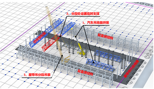 項目靠近飛機(jī)起落航道,施工作業(yè)限高,單榀桁架重達(dá)160噸,跨度130余米,無法采用常規(guī)高處作業(yè)吊裝方法,項目團(tuán)隊選取300噸履帶吊車,將一榀桁架分兩段組裝安裝,半榀桁架下部采用支撐系統(tǒng)支撐,待一榀桁架全部安裝焊接完成后,拆除支撐體系,順利完成桁架結(jié)構(gòu)吊裝。
