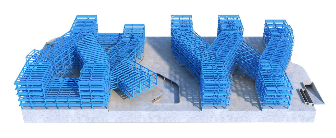 項(xiàng)目外立面采用玻璃幕墻+穿孔鋁板的雙層幕墻系統(tǒng),層次分明、美觀大氣、園區(qū)園林綠化、鋪裝園路、園藝小品、異型廊架、眼瞼雕塑采用精細(xì)化布局,營(yíng)造舒適、便捷、高效的辦公環(huán)境。項(xiàng)目地上4棟樓均為鋼框架結(jié)構(gòu),總用鋼量達(dá)7800噸,其中,城市展覽館V型柱懸挑區(qū)最大跨度達(dá)8米,創(chuàng)新研究院與實(shí)驗(yàn)樓連廊結(jié)構(gòu)最大跨度達(dá)30米,施工難度較大,項(xiàng)目團(tuán)隊(duì)充分發(fā)揮總承包管理優(yōu)勢(shì),引進(jìn)胎架支撐、圓管支撐、雙機(jī)抬吊、BIM綜合應(yīng)用等多項(xiàng)技術(shù),提高質(zhì)量管理整體水平,助力項(xiàng)目保障精益建造、高品質(zhì)履約。