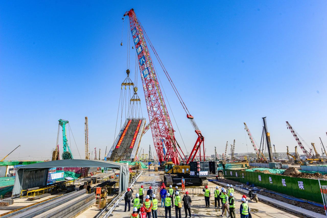 三月的濟南,春光明媚。在濟濱高鐵遙墻機場站施工現(xiàn)場機械轟鳴,熱火朝天,兩臺超百噸的履帶吊成功吊起重達38.22噸的地連墻鋼筋籠,“鋼鐵巨網(wǎng)”在空中實現(xiàn)“回直”,順利完成首幅吊裝入位,為圍護結(jié)構(gòu)連續(xù)施工奠定堅實基礎(chǔ)。