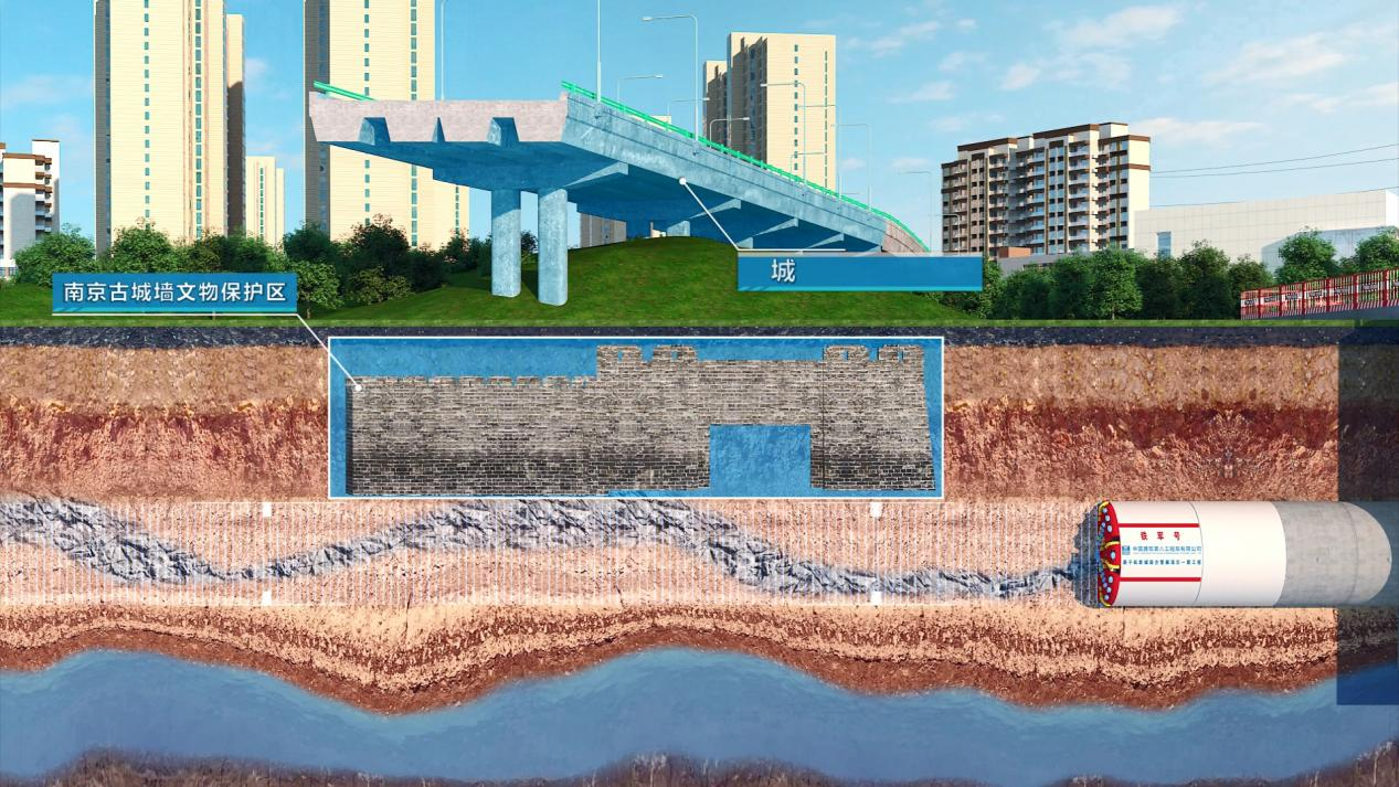 土城頭文物保護(hù)區(qū)段,為南京古城墻保護(hù)范圍,項(xiàng)目施工穿越的區(qū)域,距離地表17米,距離古城墻僅5米。該地層復(fù)雜多變,對沉降控制要求高,為最大限度保護(hù)文物,項(xiàng)目采用先小后大的頂進(jìn)方式逐個(gè)頂進(jìn),全程做好地表數(shù)據(jù)觀測,并采用深層位移感應(yīng)裝置收集地下位移數(shù)據(jù)變化,實(shí)現(xiàn)所有數(shù)據(jù)均在安全范圍內(nèi),最終實(shí)現(xiàn)完美頂進(jìn)。
