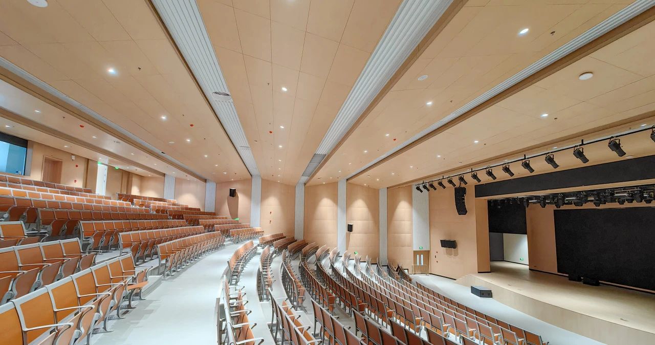 行政樓報(bào)告大廳大氣亮堂,可容納800多人,天花板和墻面采用吸音板和聲音反射、擴(kuò)散材料,在增強(qiáng)隔音的同時(shí)提升室內(nèi)聲音傳播效果。