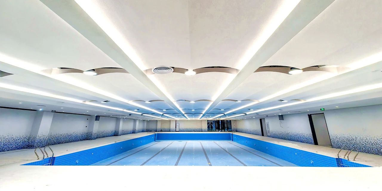 游泳館水池分淺水和深水區(qū),且采用專用防滑藍(lán)色地磚天花波浪造型的陶晶沙吸聲,板墻面藍(lán)白漸變的馬賽克配合泛光照明,使空間色彩動(dòng)感多變,營(yíng)造活力水上樂園的氛圍。