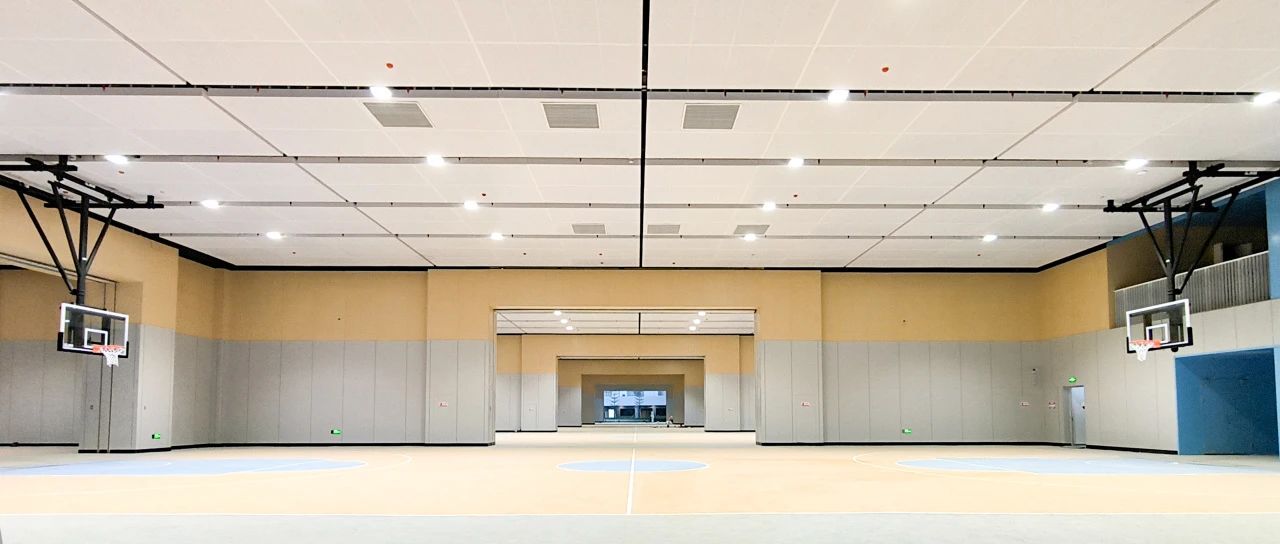 足球場(chǎng)底部以“架空層”的形式,共設(shè)有8個(gè)標(biāo)準(zhǔn)籃球場(chǎng),天花板采用白色穿孔吸音鋁板,球場(chǎng)墻面底部為灰色護(hù),墻板上部為木紋紅波吸聲板,休息區(qū)為藍(lán)色鋁板場(chǎng)地色彩活潑明快,空間隔音效果絕佳。