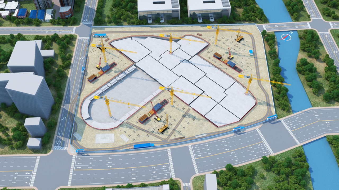 項(xiàng)目為半地下室切割施工,現(xiàn)場(chǎng)施工區(qū)域分段較多,同時(shí)首層多為架空層,各單體銜接測(cè)量精度要求高,項(xiàng)目借助學(xué)校整體BIM模型,提前規(guī)劃項(xiàng)目施工平面布置,合理布置材料堆場(chǎng)與施工道路,結(jié)合現(xiàn)場(chǎng)實(shí)際進(jìn)度,適時(shí)調(diào)整場(chǎng)地平面布置轉(zhuǎn)換。