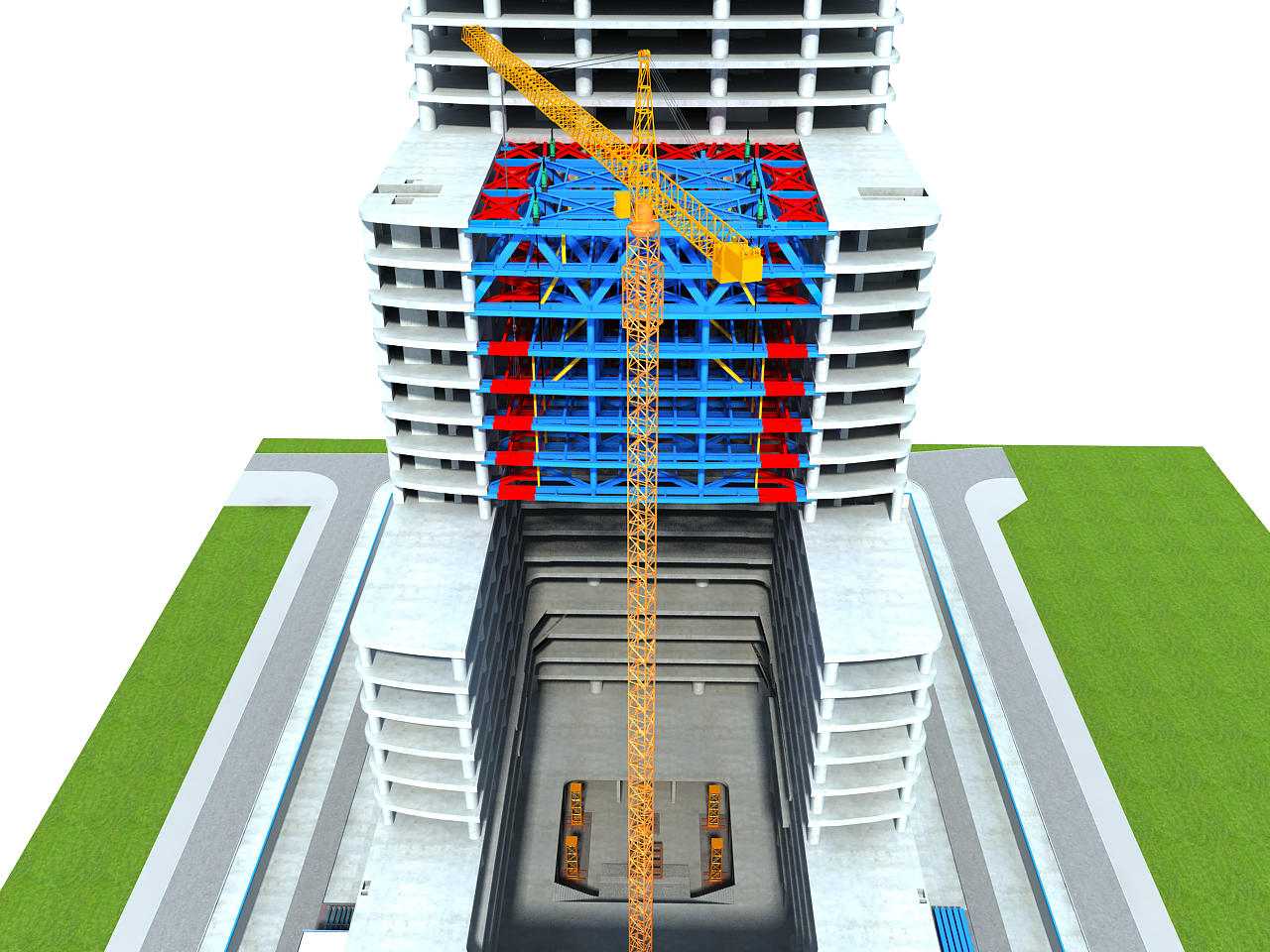 鋼連廊提升過程中,項(xiàng)目團(tuán)隊(duì)設(shè)置6個(gè)提升支架,每處支架安裝兩臺提升設(shè)備,提升設(shè)備由電子設(shè)備集中控制,可準(zhǔn)確完成數(shù)據(jù)反饋和控制指令傳遞,實(shí)現(xiàn)同步動作、負(fù)載均衡、姿態(tài)矯正、應(yīng)力控制、操作閉鎖、過程顯示和故障報(bào)警,同時(shí)應(yīng)用多項(xiàng)先進(jìn)施工技術(shù),通過模擬計(jì)算,實(shí)現(xiàn)分段整體提升和高空散拼裝,有效結(jié)合解決了有限空間下大跨度超高層鋼連廊施工難題,保障鋼連廊順利提升。