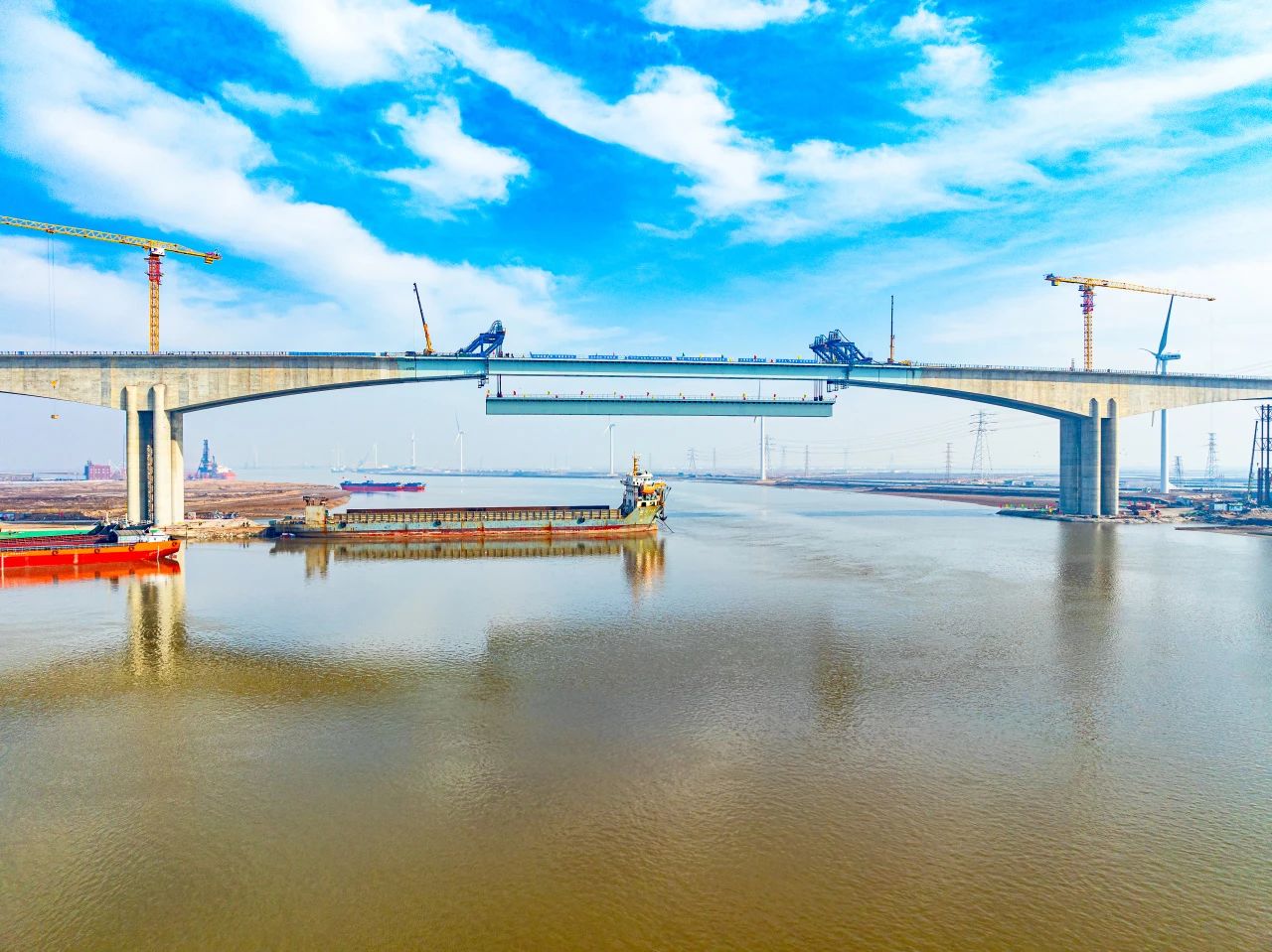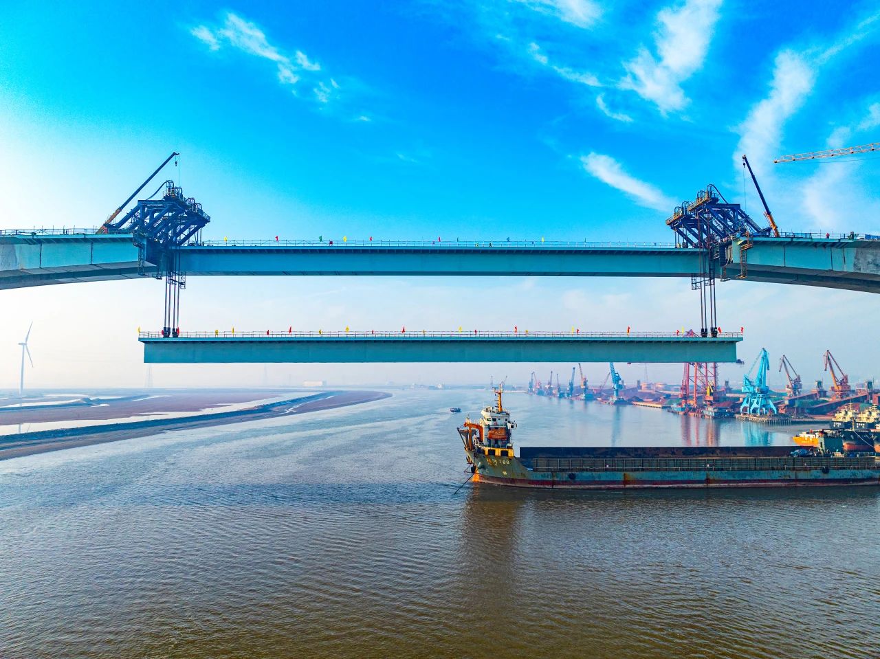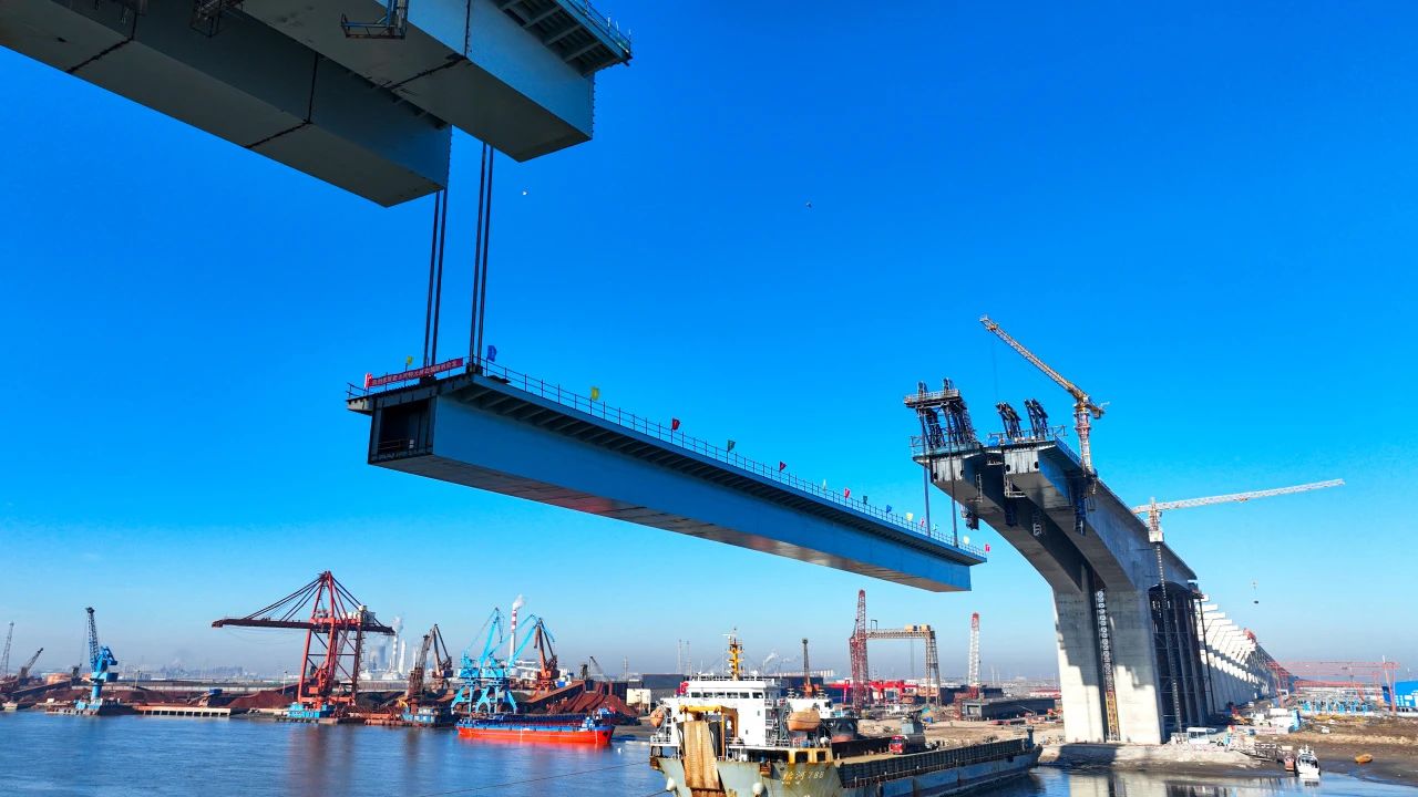 一橋飛架,跨越山海,天塹變通途.近日,隨著千噸級箱梁精準(zhǔn)吊裝到位,中建八局投資建設(shè)運(yùn)營的G228丹東線濱州段項(xiàng)目世界第一跨徑混合梁橋套爾河特大橋正式合龍,刷新一項(xiàng)新的世界紀(jì)錄。