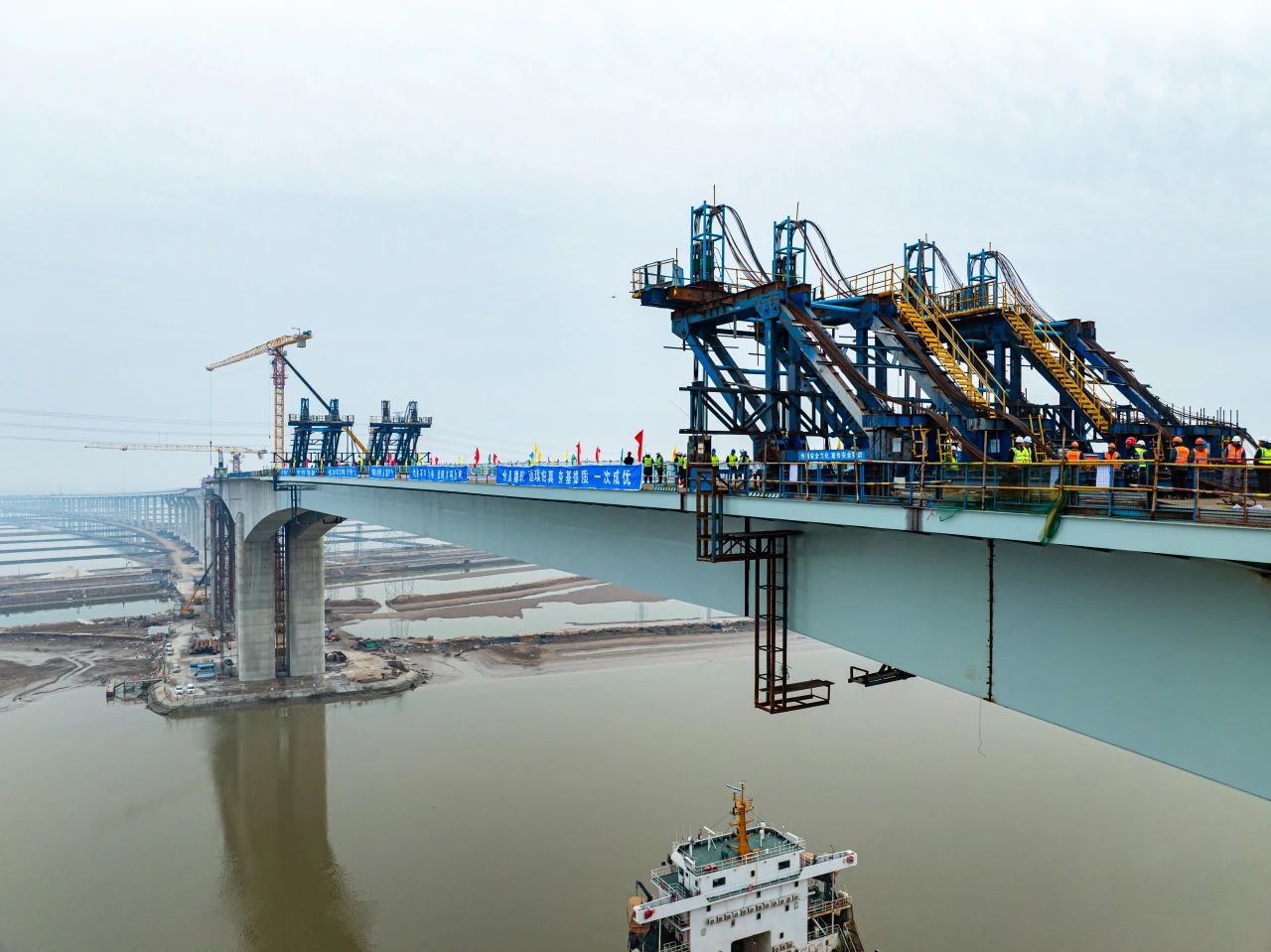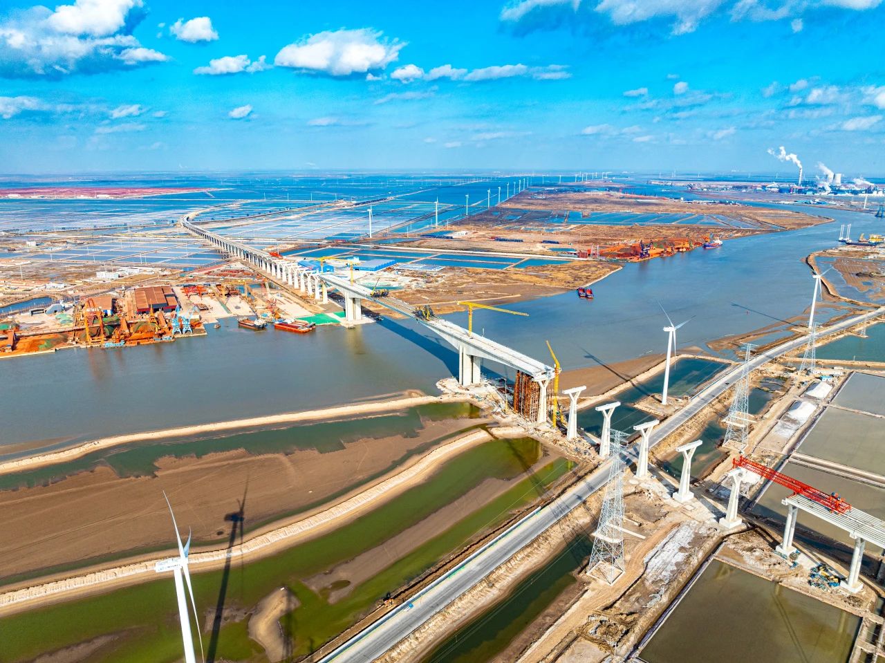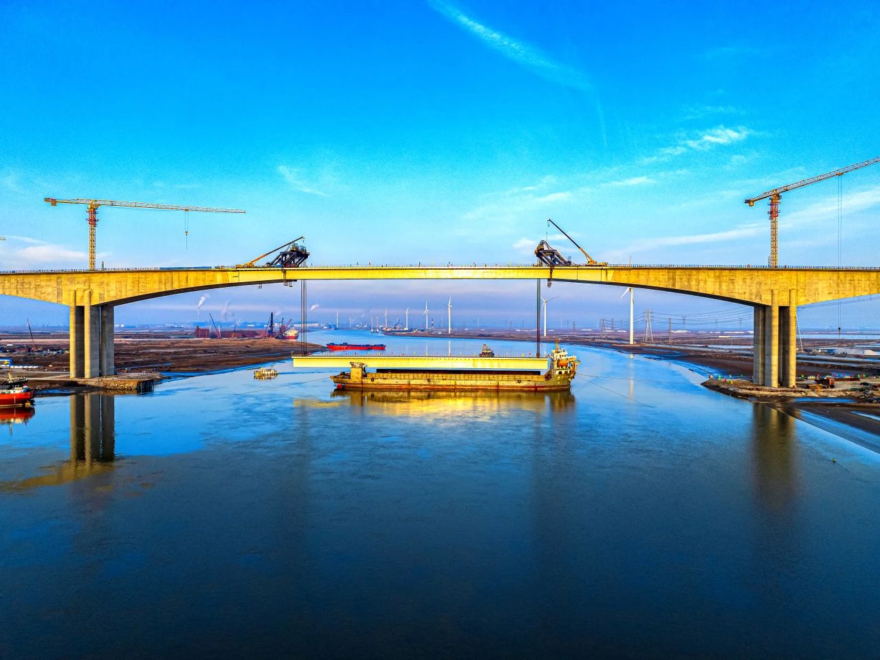 一橋飛架,跨越山海,天塹變通途.近日,隨著千噸級箱梁精準(zhǔn)吊裝到位,中建八局投資建設(shè)運(yùn)營的G228丹東線濱州段項(xiàng)目世界第一跨徑混合梁橋套爾河特大橋正式合龍,刷新一項(xiàng)新的世界紀(jì)錄。