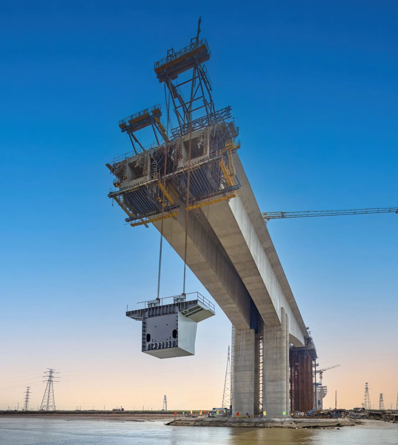 由于項(xiàng)目地處渤海入???,大型浮吊受限于通航寬度無法駛?cè)?,為攻?jiān)千噸重鋼梁托舉難題,項(xiàng)目研發(fā)智能吊掛一體機(jī),實(shí)現(xiàn)混凝土懸臂澆筑與鋼梁吊裝的智能化、自動(dòng)化作業(yè)和施工全過程的智能控制與監(jiān)測,為復(fù)雜大跨橋梁施工帶來了全新解決方案。