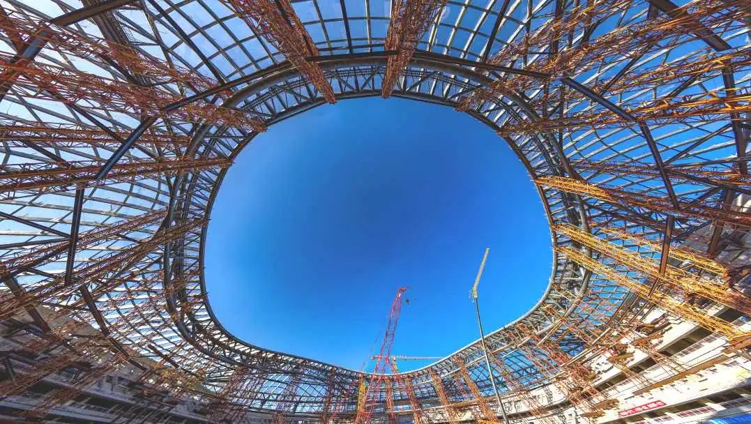 近日,中建八一承建的黃河體育中心專業(yè)足球場項目全面完成屋蓋鋼結(jié)構(gòu)施工,“黃河明珠”成功戴上1.6萬噸“鋼鐵巨冠”,標志著項目攻克國內(nèi)體育場館懸挑長度之最,正式進入索、膜結(jié)構(gòu)及金屬屋面施工階段。