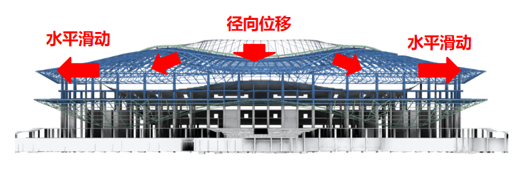 項目屋蓋鋼結(jié)構(gòu)通過滑動支座與下部36根排架柱焊接固定,卸載過程支座會產(chǎn)生水平滑動,對卸載精度將產(chǎn)生影響。項目聯(lián)合重慶大學(xué)科研團隊研發(fā)“正向施工過程分析和反向迭代計算”,為鋼結(jié)構(gòu)施工預(yù)變形分析提供算法支撐,成功將滑動支座安裝精度控制在±30mm內(nèi)。